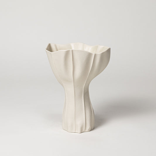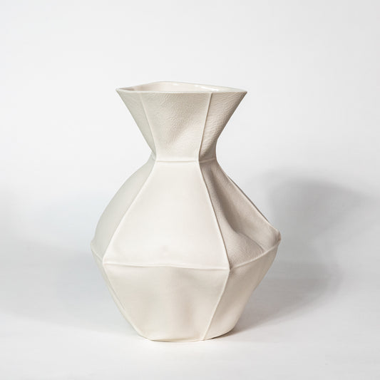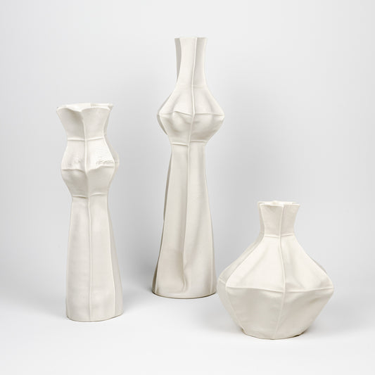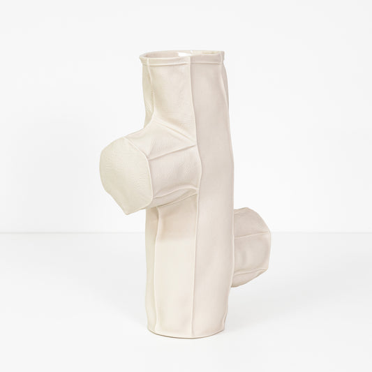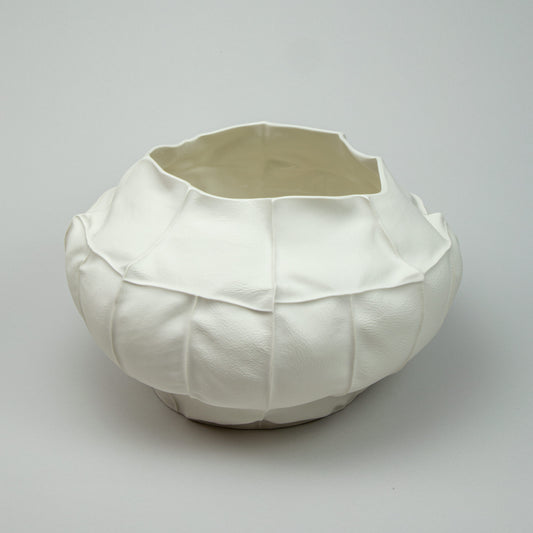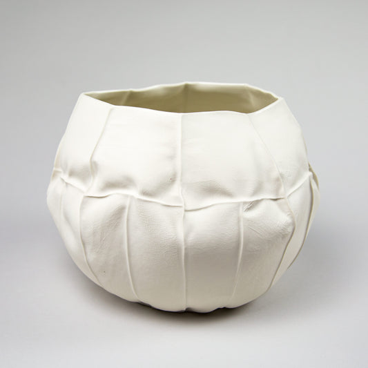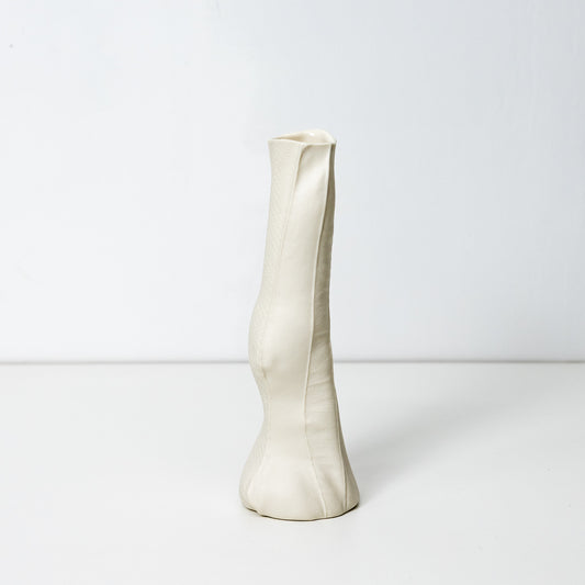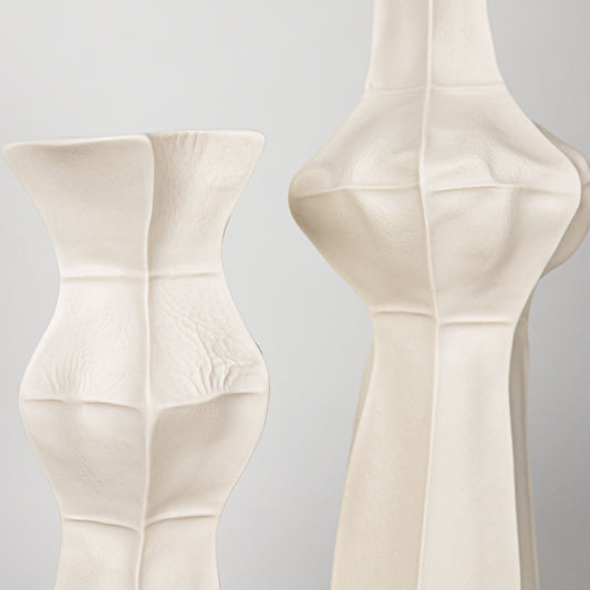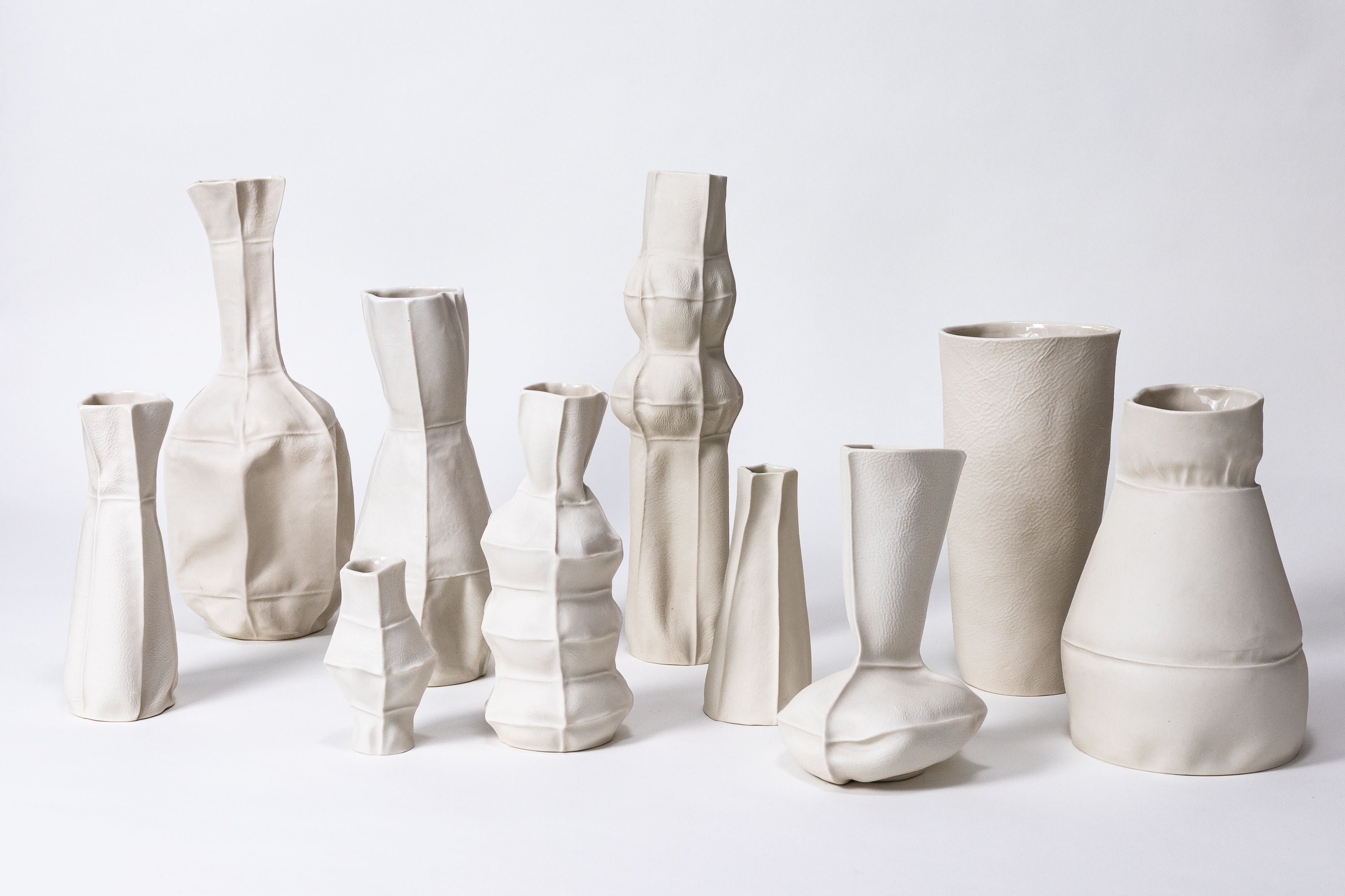 The Kawa Series is crafted using an unusual, painstakingly refined technique unique to Luft Tanaka. Each creation begins as a simple sketch, which is then transformed into a leather mold. After cutting, sewing, and preparing the mold for casting, liquid porcelain is poured inside, slowly forming a thin layer along the leather surface. Once the porcelain sets, the mold is carefully cut at the seams and gently peeled away, allowing the piece to be fired in a kiln.