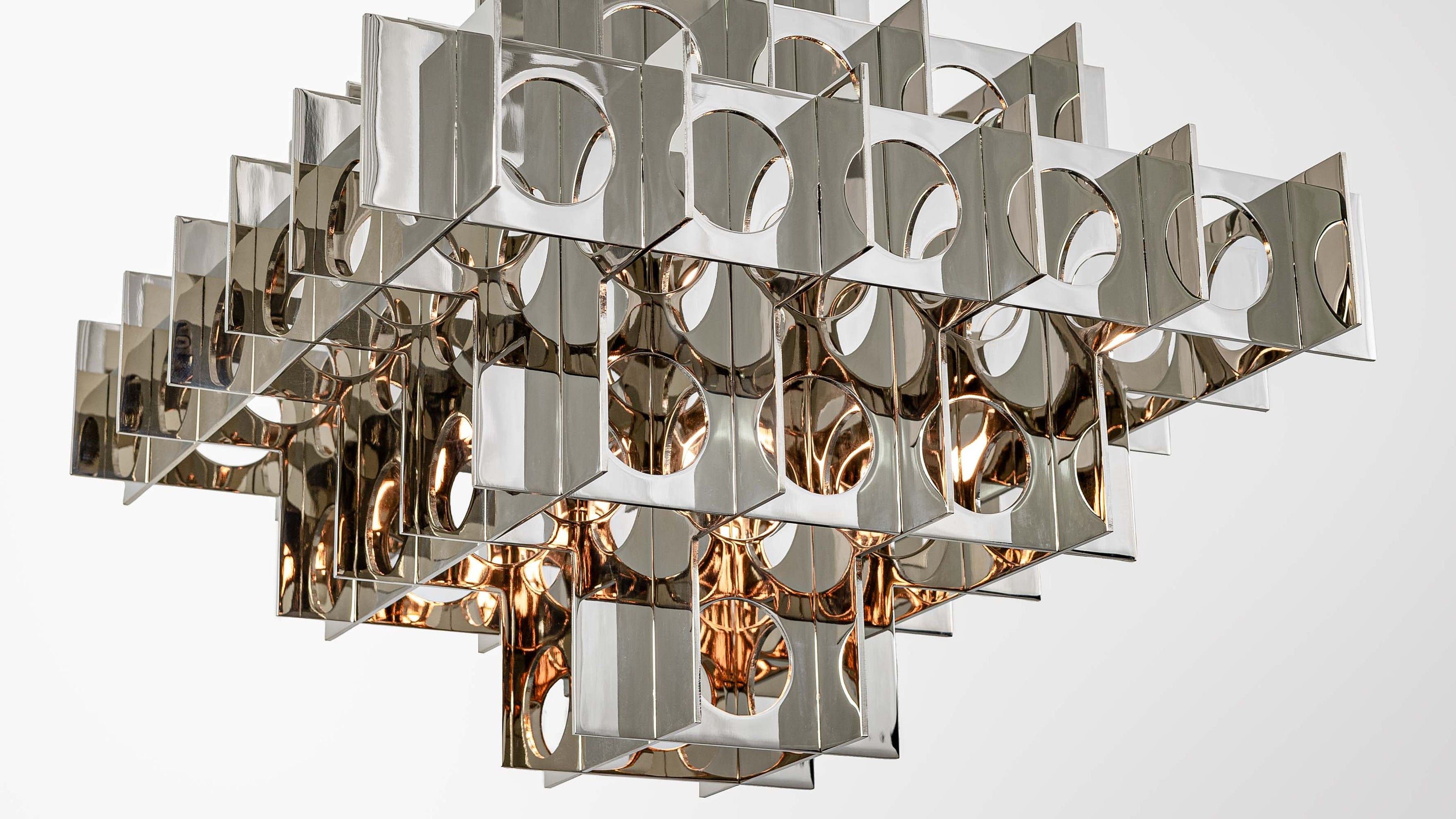 Brutalism meets glam. Drawing inspiration from Brutalist architecture and Op Art, the Tenfold Series features perforated metal panels that create a captivating visual effect. Its geometric design is elevated by a polished surface and repeating circular cutouts, allowing light to pass through and reflect in mesmerizing ways. The Tenfold Series is available in a range of sizes and finishes to create a bold yet refined statement.